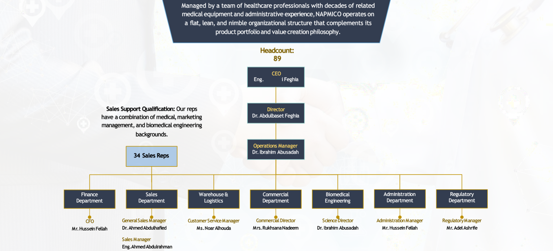 NAPMICO was founded in the mid-90s by Elbahi Feghia, an electrical engineer by profession, to structure and serve the Libyan medical and pharmaceutical markets.